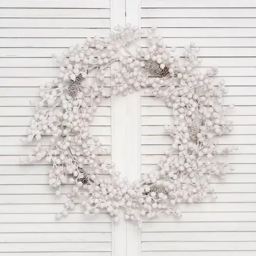 Рождественский заснеженный венок «Адель» напоминает свадебное украшение невесты. Декор кипенно-белого цвета поразит в самое сердце любителей роскоши, но даже если вы себя к таковым не относите, он обязательно вам понравится. Это белоснежное великолепие будет отлично смотреться в вашем доме, в каком бы стиле он ни был оформлен. И шикарный дизайн, и ослепительно-белый цвет прекрасно гармонируют с любой цветовой гаммой и обстановкой. Ваше жилье будет выглядеть по-новому, а праздник придется по душе всем!
